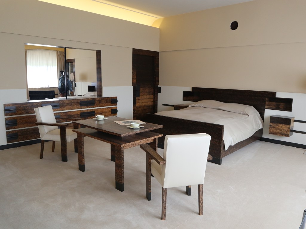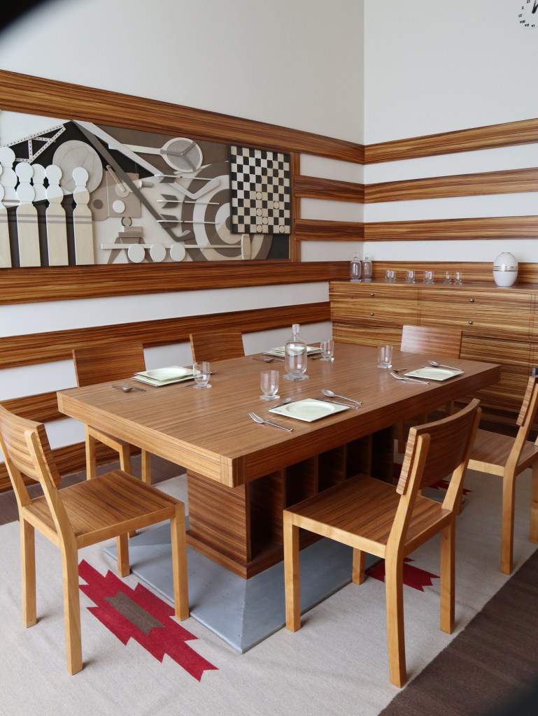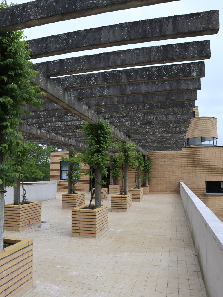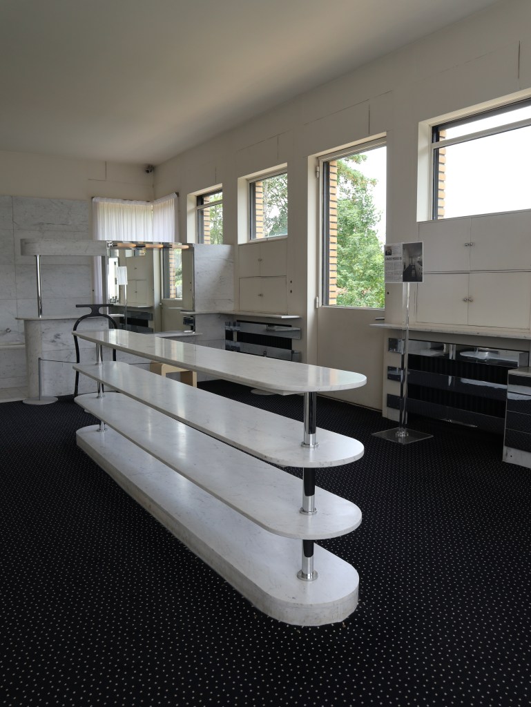 De vleugel van de ouders is iets helemaal anders. Hier valt nog meer dan elders in het huis op dat Mallet-Stevens niet echt veel budgettaire beperkingen had. Vermoed ik toch. Vooral de badkamer met dressingzone is adembenemend mooi. Een fantasie in wit marmer. Wist je trouwens dat een deel van het meubilair dat je in het huis ziet origineel is? Andere meubels en decoratie werden getrouw aan het origineel nagemaakt, en geplaatst zoals op de foto’s van vroeger te zien is. Nog een trap hoger zien we de speelzaal en studeerkamer van de kinderen, én een prachtig dakterras, met heel wat groen. Een groot verschil met de andere terrassen – en dat zijn er nogal wat – rond het huis, die er heel kaal bijliggen.