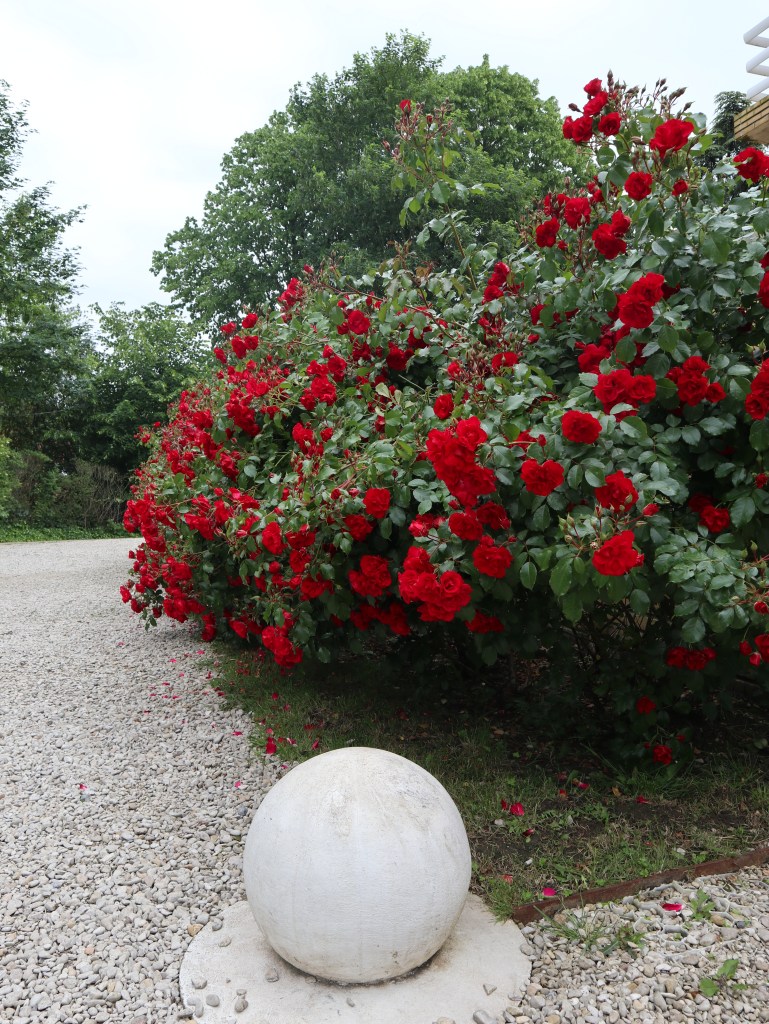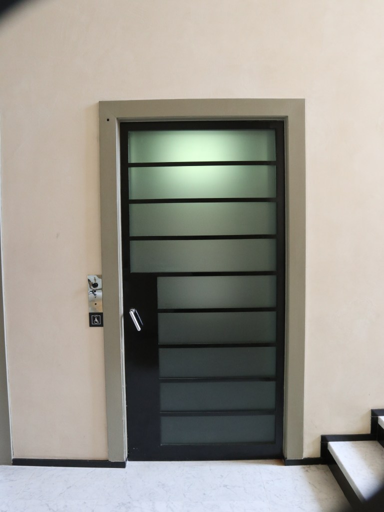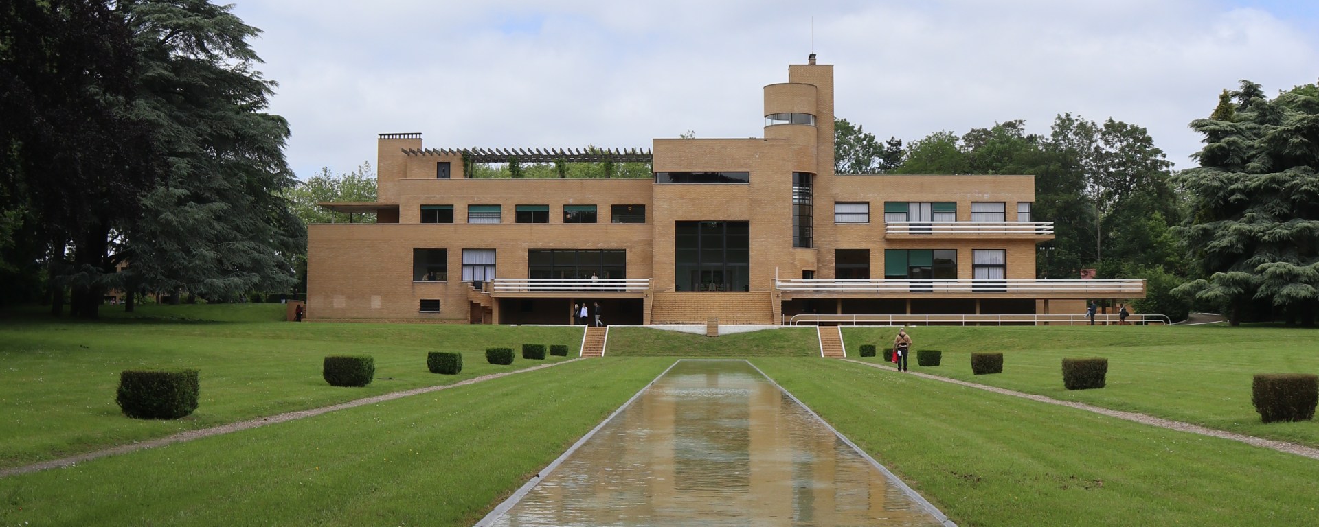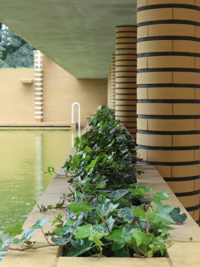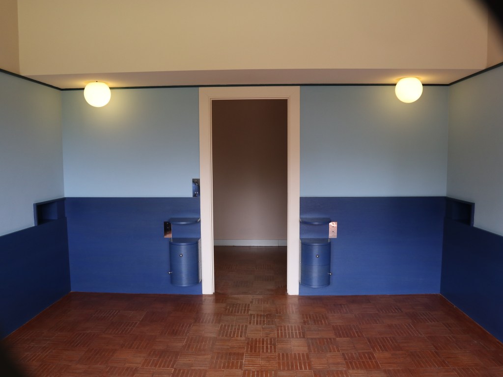 Villa Cavrois is dus gigantisch groot, ook al is dat vanaf de straatkant niet te zien. Pas wanneer ik na een bezoek aan de ticketshop in het voormalige bewakershuis de tuin inwandel, krijg ik het enorme gebouw in mijn vizier. De gele bakstenen, de verschillende niveaus en de vele details zijn indrukwekkend. En dan weet ik nog niet hoe bijzonder het oog voor detail van Mallet-Stevens was. Neem nu de witte bollen bij de rozelaars aan de voorkant van het huis… Die zie ik in het huis zelf terug in de vorm van de ronde lampen die in quasi elke kamer aanwezig zijn, en vaak ingewerkt in het plafond zitten.